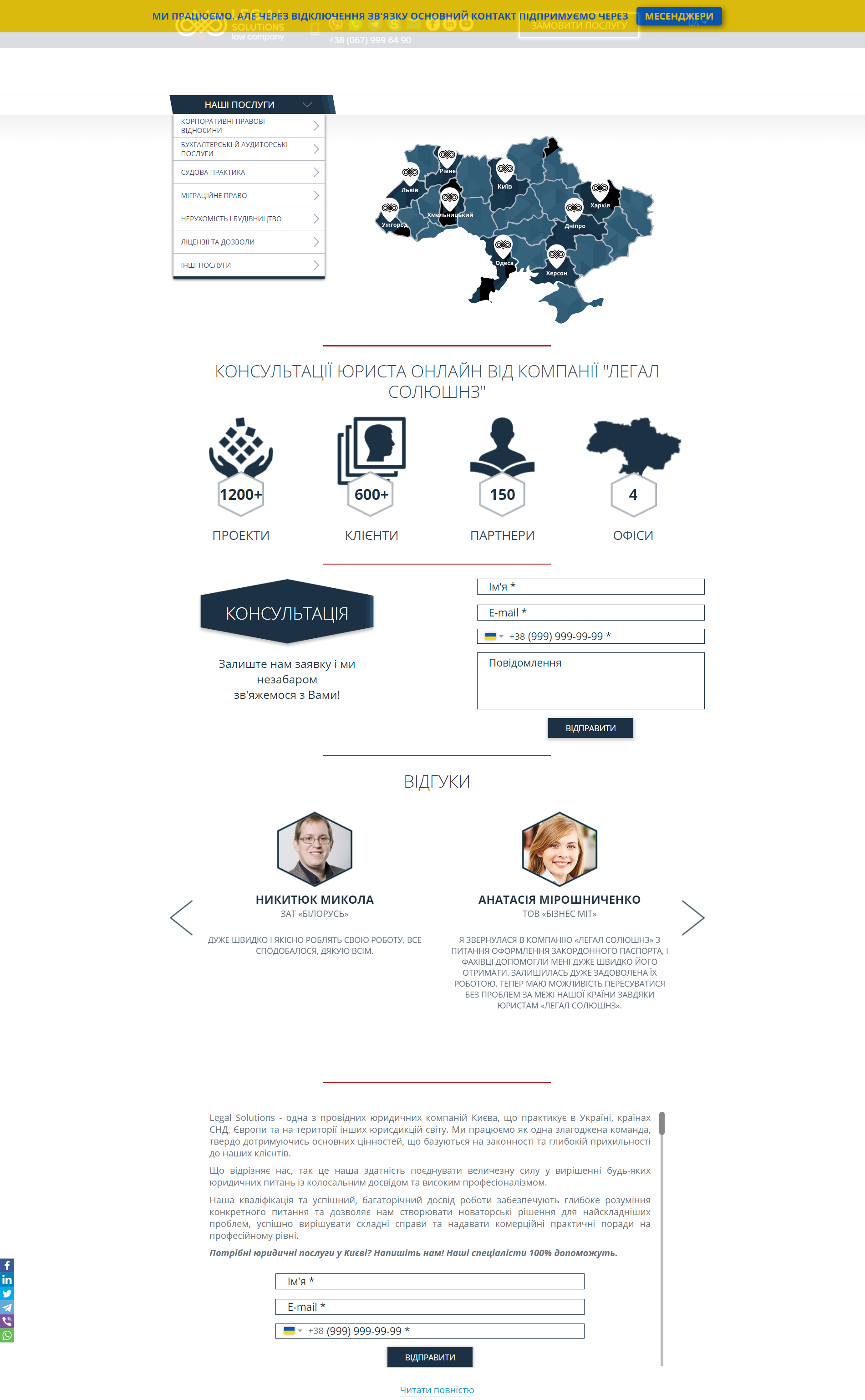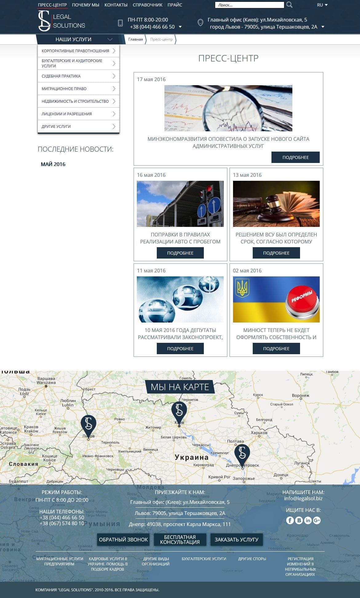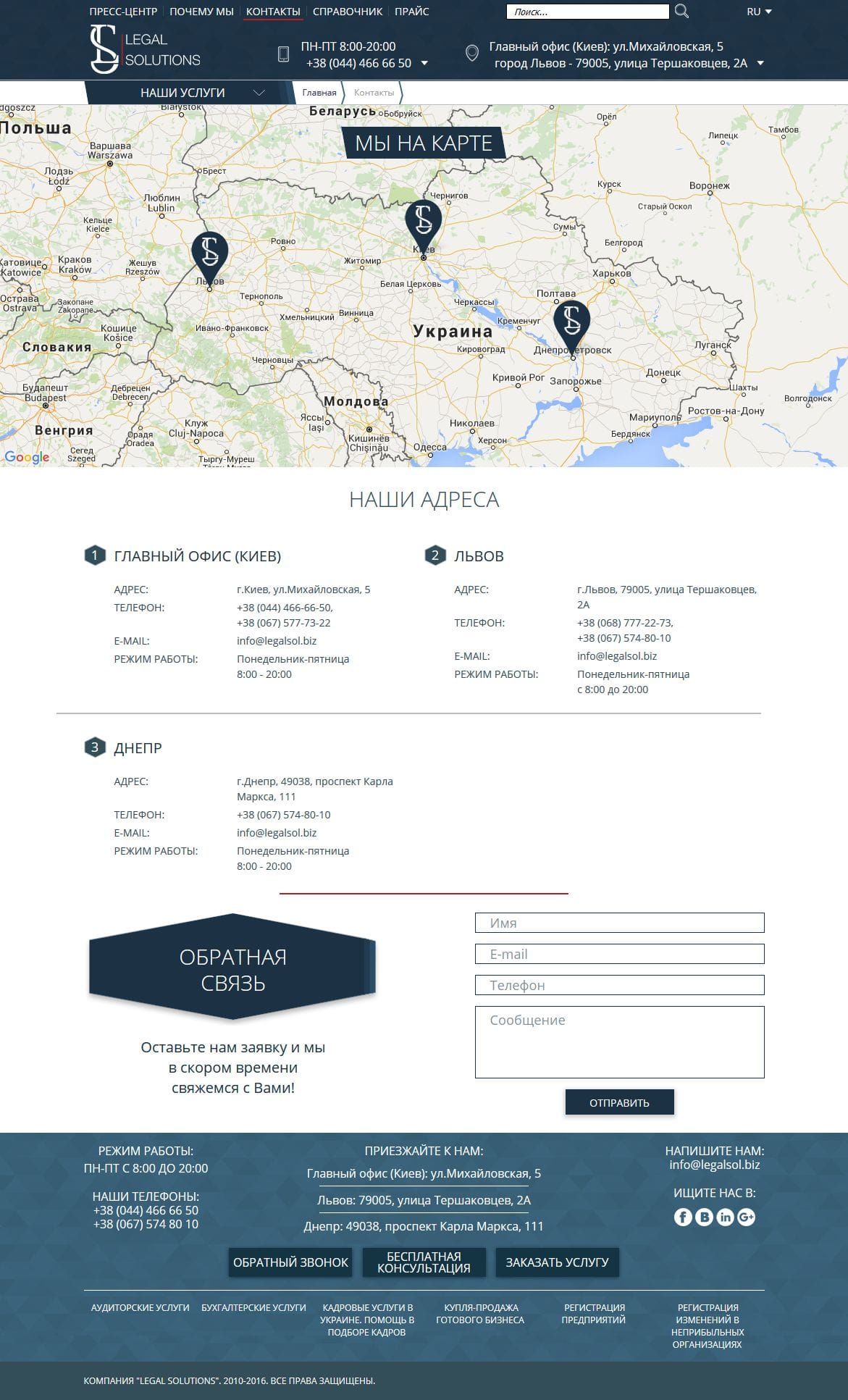 Юридическая компания «Легал Солюшнз» оказывает комплексные юридические услуги малому, среднему и крупному бизнесу на территории Украины. Наша задача была создать технологичный эргономичный и понятный клиенту сайт, который будет отличаться широким спектром услуг и в тоже время удобством перемещения по сайту. После сдачи поступила задача продвижения сайта путем оптимизации его под поисковые системы. Маркетинговая студия "Маркетинг Микс" провели колоссальную работу по внутренней оптимизации и дали начало ссылочному продвижению.